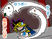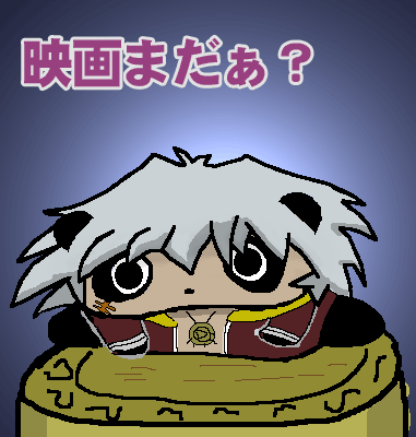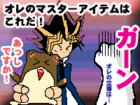 ヅラ絵−第4弾! 『たれバクラ』を作ってみました。 『冥界の石盤』の上に座る盗賊王というつもりで作ったのですが、石盤が”今川焼き”みたいで、ちょっと迫力が出ませんでした。 |