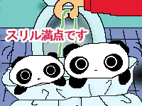 ![]() 【今日のクロたれとノスたれ】 大徳寺先生、危機一髪! 先生から情報を聞き出そうとした十代が取った行動は、なんと、「白状しないとトイレに流しちゃうよ〜」作戦であった! 流される先は、なんだかイヤ〜な場所らしいと想像してみるクロたれとノスたれ たれぱんだはトイレに行かない! だから、その場所がどれほど恐ろしい地獄なのか分からなかったのだ! 気になったのは、袋に入ってブラブラされること! なんだか面白そうなので、こっそり大徳寺先生と交代し、自分たちが身代わりになってみるのであった! 大徳寺先生を脅すつもりだったのに、気が付けば、可愛いたれぱんだにすり替わっていた! ブラブラさせると、キャッキャッと喜ぶので、仕方なく相手をする十代であった… |