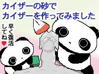 ![]() 【今日のクロたれとノスたれ】 ノンビリとGXを見ていたクロたれとノスたれ! しかし番組の中では衝撃的な事件が起こっていたのだった!! 大好きなカイザーが砂になっちゃった!!! これは大変と駆けつけたクロたれとノスたれ… 哀れ、カイザーの身体は本当にさらさらの砂に変わっていたのだった! たれぱんだ星の技術を使えば、砂から人間を作る事なんて簡単! さっそく砂を集め始めたのだった!! 一生懸命に砂を集めているうちに、砂遊びをしたくなってしまったクロたれとノスたれ こっそり砂でカイザーを作ったりしてみた… とても上手にできたので、嬉しくなった2匹であった… |
