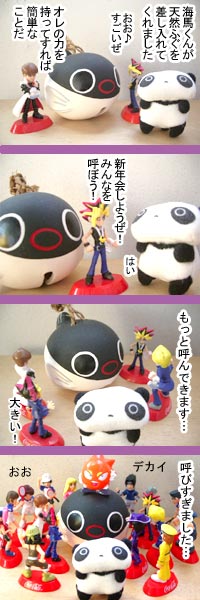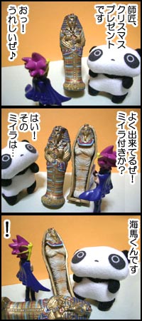ほのぼの♪クリスマス漫画 このファラオの棺とミイラは食玩のシークレットでした。 まさか、こんな形でネットデビューさせるとは思いませんでした。 海馬くんイジメな話になっていますが、弟子と海馬くんは仲良しです。 |