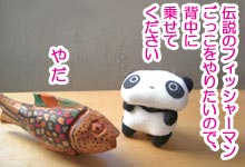 ![]() | 南米のグァテマラで買った木彫りの魚で遊んでみました。 たれ弟子の短い足では魚をまたぐだけでも大変そうです。 |