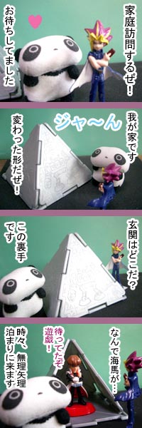 ![]() | ▲のパズルはカナダのバーガーキングで配られた景品です。 表面には色んなモンスターが描かれていました。 弟子はピラミッド・パワーを取り入れて強いデュエリストになりたいらしいです。 社長がどうして泊まりに来るのかは謎です。 |