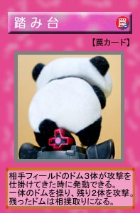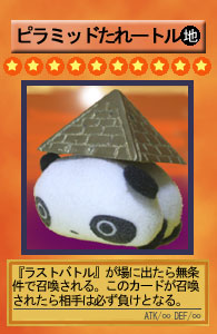 ![]() | カードパロです。 この頃はオンラインでいつも『ラストバトル』に泣かされていました。 くやしいのでこんなカードを作ってみました。 今は禁止カードになったので、ホッとしています。 弟子が身体に乗せているピラミッドはエジプト人の少年からもらいました。 たまたま公共バスに乗り合わせ、カタコトの英語で会話してたら気に入られたみたいで、「ボクの手作り」と言いながらプレゼントしてくれました。 |