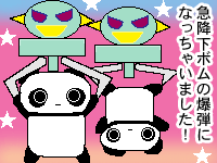 ![]() 【今日のクロたれとノスたれ】 ボマーさんがダーク・シグナーになっちゃった! 彼のファンだったクロたれとノスたれも大ショック! こっそりボマーさんの様子を見に行った2匹だが、デュエルの相手はお友達のクロウでまたまたショックを受けたのだった! ボマーさんの「急降下ボム」がクロウにダメージを与えると知ったクロたれとノスたれ 衝撃を軽くしようと自分たちが爆弾と入れ替わってみたのだった! 爆弾かと思って見上げてみたら、なんと可愛いパンダがぶるさがっていた! こんな爆弾ならドンドン落として欲しいと思うクロウであった… |