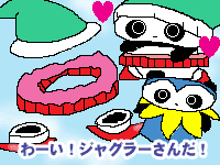 ![]() 【今日のクロたれとノスたれ】 ノンビリとデュエルを見ていたら、いきなり「ジャグラー」登場! まさかこんなところで会えるなんて思わなかったクロたれとノスたれ! 実は彼らにマジックを教えてくれたのは、この「ジャグラー」さんだった! 「お久しぶりです!」と挨拶しに行こうと思ったクロたれとノスたれ。 とりあえず、喜んで貰えるようコスプレして行くことにしたのだった! 今まで陽の当たることがなかった「ジャグラー」さん。 まさか自分が5D'sに参加できるとは思わなかったし、可愛い弟子たちに再会出来るとは思わなかったので、もう〜心はニコニコなのだ! でも顔が見えないので、その心が2匹に分かってもらえない どうやったら気持ちが伝わるか、ちょっと悩む「ジャグラー」さんであった… |