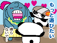 ![]() 【今日のクロたれとノスたれ】 「オカッパ」キャラの登場!! 一目見て恋に落ちてしまったクロたれとノスたれ(そして私) 名前も分からない「白いヒト」にさっそく花束を持って挨拶に行くのだった! しかし、あまりの可愛らしさに声が出ず、花を持ったまま、立ちすくんでしまうのだった! 可愛いパンダが接近していることに気がついた白いヒト。 無表情に見えるけど、実は友だちになりないなぁ〜と、こっそり思っているのであった… |