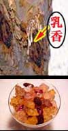 ■フランキンセス(乳香にゅうこう)(Frank incense)またはオリバナム(olibanum) 幹に傷をつけると、写真のように白いお乳がしみ出てきます。これを乾燥させると、黄色い樹脂になります。 使用方法はミルラと同様です。 |