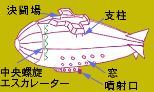 決闘艇はそれほどの人数を乗せる構造にはなっていませんが、最上部の決闘場、そして螺旋エスカレーターなどかなりバランスの悪い施設が付属しているので、意外に全体は大きいかもしれません。