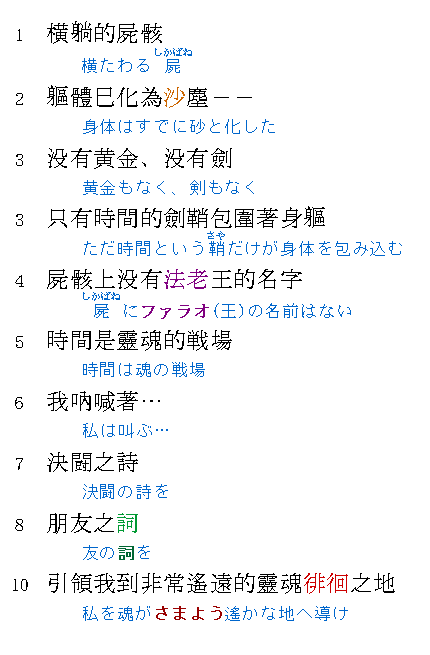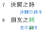 ![]() | ★原作では、『闘いの詩(うた)を−友の詩(うた)を』という風に、「詩=うた」と読ませています。 ★中文版では「朋友之詞」とし、「詩」ではなく「詞」に変えてあります。 この違いはなんでしょうね…で、調べてみたのですが、「詞」の場合は「話し言葉や感情や思想が表現されたもの」となり、「詩」は一定の韻律などを有し、美的感動を凝縮して表現したもの。と言う風になるそうです。 翻訳者は『朋友』という言葉に注目し、闘いの詩は美麗句でも、友の詩はもっと心に届くモノだと思って、あえて「詞」を使ったのかもしれませんね。 このちょっとした気配りが読み手の理解を深めます。 |