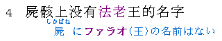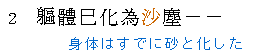 ![]() | ★原作では人間の身体となる言葉を 「屍(しかばね)」、「身」、「器(うつわ)」、「骸(むくろ)」 と4種類に分けています。 そのため、翻訳者もそれぞれ 「屍骸(死骸)」、「躯体(遺体)」、「身躯(からだ)」 と使い分けています。 翻訳者のやる気が出てますねぇ(^-^)。 ★ ここの表現の見どころは、「沙」です。 原作では「器は『砂』となり…」で「砂」という字を使っているのですが、ここでは「サンズイ(水)が少ない」の『沙』を使っています。 この漢字から、屍もすっかり水気が抜け、サラサラと風化しているイメージが頭に浮かびますね。 |