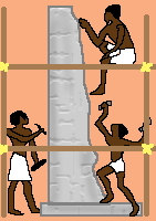 ■デュエリストの石版を作る方法と道具を紹介します。 図のように、刻むための石材をしかるべき場所に設置します。 ★参考に描いた図だと裏側にも人がいますが、本来、壁画に裏側はないので(笑)、そこんとこヨロシクです(^_^;) ■大きな石版の場合、足場をこのように組み、数人で彫ったりします。 下絵はすでに細い線で描かれているので、彫り師はその線を頼りに彫り上げていきます。 ★『デュエリストの石版』を神官セトが彫ったと思っている方もいらっしゃるかと思いますが、エジプトではこのような技術者は大体が世襲制なので、石工でもない神官が石を彫ったりすることはありません。 世襲制する最大の理由は「技術の保護」と「伝授」にあります。 一族で独占することにより生活が保障される…そんな感じです。 |