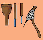 ![]() | ■当時の道具 新王国時代の道具は主に青銅製のノミやキリなどが使われていました。 大まかに削る場合はこのような道具を使い、研磨する時は砂漠の砂を利用しました。 |